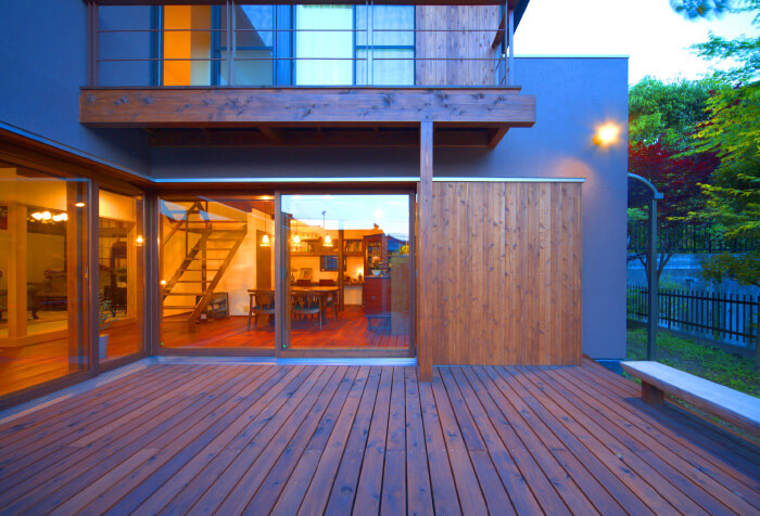 室内と屋外を隔てる間口の広い木製サッシは担当の設計士様とのコラボレーションで、こだわりの逸品。室内から延びる段差のないウッドデッキにより室内からの導線がスムーズでより部屋を広く見せ、解放感あふれる住宅となりました。
